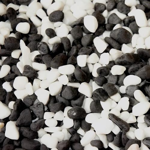 White and black aquarium gravel is a popular, decorative, and functional substrate, often featuring a blend of white/beige and black/grey stones ranging in size. It is widely used to enhance the aesthetics of aquariums, aquascapes, and vivariums, frequently utilizing epoxy-coated, non-toxic materials that do not affect the pH of the water.