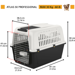 Characteristics: Thermoplastic resin carrier to travel by car, train, boat or plane Plastic-coated iron door and security locking system with four fixing points Door with a mesh of 25 x 25 mm according to the current IATA regulations Lateral locking catches with safety blocking system Retractable and extendable handle with a compartment for objects Large grilles for internal air circulation Plastic feeder included Hygienic draining mat included With holes for the screws (included) Includes handy bands to be applied on the door Possibility to use a wheel set to make it easier to move the carrier or a Tirso water dispenser (optional) Also available as an accessory is a specific net kit to travel by train, boat or plane and to fix to the side ventilation grills Note: Contact your air company to make sure the carrier can be boarded Maximum capacity Atlas 50 Professional: 30 Kg Atlas 50 Professional net weight: 7,68 Kg