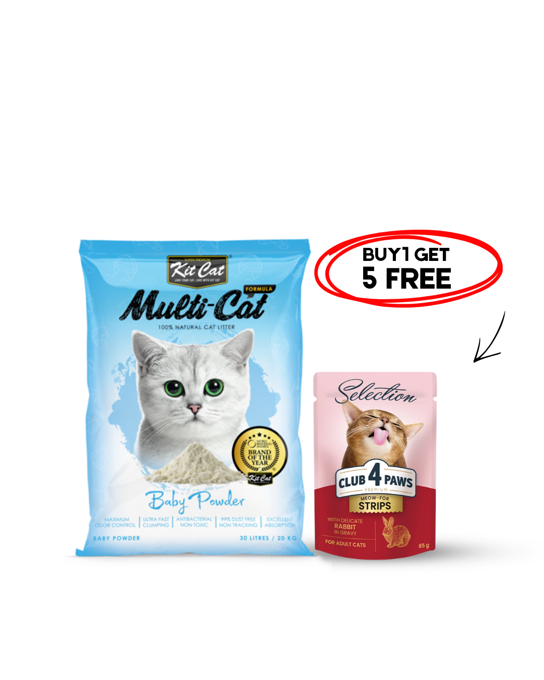 Kit Cat Multi-Cat Baby Powder 20kg is specially formulated by cat lovers to provide exceptional odor control and ease of cleaning. Its superior hard clumping ability makes cleanup a breeze—simply scoop the clump and throw it away. The rest of the litter remains clean, odorless, and ready to reuse, making it a very economical and environmentally friendly choice.