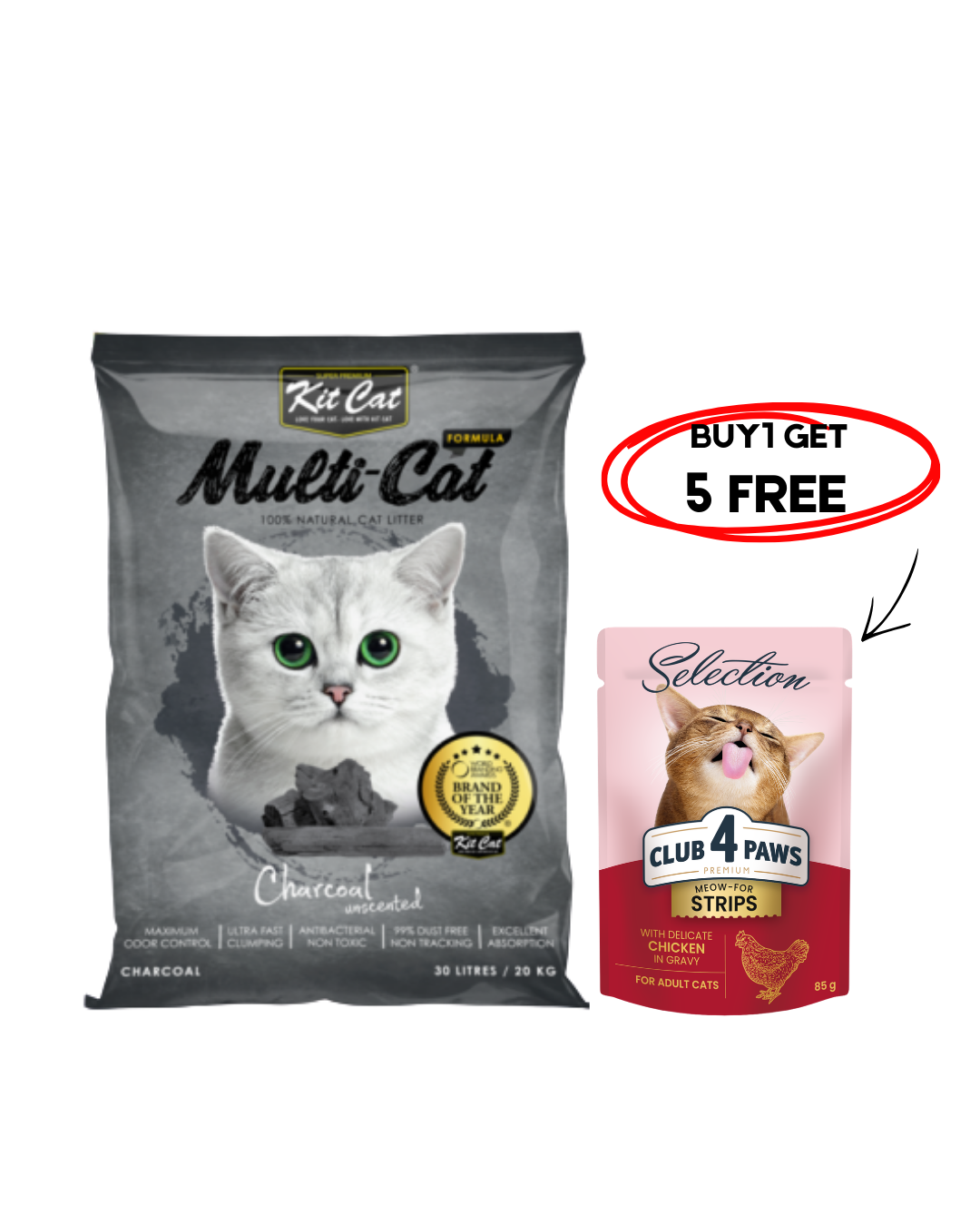 Kit Cat Multi-Cat Charcoal 20kg is specially formulated by cat lovers to provide exceptional odor control and ease of cleaning. Its superior hard clumping ability makes cleanup a breeze—simply scoop the clump and throw it away. The rest of the litter remains clean, odorless, and ready to reuse, making it a very economical and environmentally friendly choice.